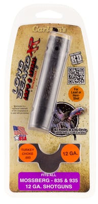 Long Beard Turkey Features Carlson’s Long Beard Turkey Choke has been specially designed to produce the best patterns when shooting Winchesters Long Beard Turkey loads. This ammunition features Shot-Lok Technology that allows for the tightest patterns and longer downrange reach over any lead turkey load on the market. Pair this ammunition’s capabilities with the new Carlson’s Long Beard Turkey Choke and you have a devastating, gobbler-killing combination. This tom-dropping dynamic duo serves-up 10% greater penetration over standard lead shot at distances of more than 50 yards, terminal on-target performance and allows nearly perfectly round shot to be thrown from the barrel for extremely tight, long-range patterns. *Note- No steel shot larger than #4 may be used in our Turkey Choke Tubes. Long Beard Turkey Specifications Brand: Carlson’s Choke Tubes Category: Choke Tubes Gauge: 12 Gauge Model: Long Beard Turkey Color: Blued Material: 17-4 Stainless Steel Constriction Diameter: .683 Constriction Type: Turkey Style: Ported Chokes Included: 1 Configuration: Mossberg 935