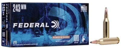 PowerShok .243 Win Features The traditional lead-core hunting bullets in Federal PowerShok rifle loads provide solid accuracy and power at an affordable price. They feature reliable Federal brass, primers and powder and are suited to a wide variety of medium and big game. PowerShok .243 Win Specifications Caliber:.243 Win Model’-Shok Bullet Weight:100 gr Rounds Per Box:20 Casing Material:Brass Application:Medium Game Boxes Per Case:10 Bullet Type:Jacketed Soft Point (JSP) Muzzle Energy:1945 ft lbs Muzzle Velocity:2960 fps