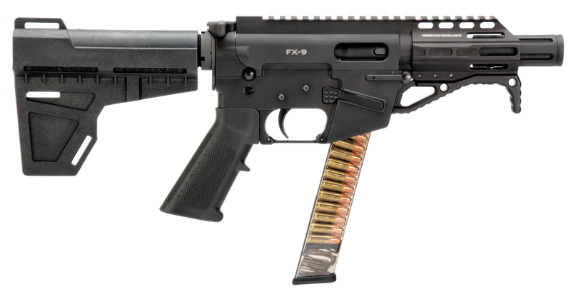 Freedom Ordnance FX9 Features Freedom Ordnance FX-9 4.5″ 9mm AR style pistol uses Glock style magazines. The pistol has an enhanced extractor and bolt package. Features a Billet receiver 1″ shorter than standard AR-15, 3.5″ Freedom M-Lok free float handguard, handstop (designed for the FX9P4), last round bolt hold open, AR-15 style oversize Recurve charging handle and anti walk pins. This pistol is compatible with 9mm approved 1/2″x28 TPI muzzle devices and suppressors. Includes ETS 31rd Glock style magazine. Made in the USA. Freedom Ordnance FX9 Specifications Caliber: 9mm NATO Model: FX-9 Stock Finish: Black Action: Semi-Auto Sights: None, Optic Ready Capacity: 31+1 Muzzle: Fluted Muzzle Enhancer Grips: Black Polymer Hand: Right Includes: Magazine Overall Length: 18.50″ Receiver Finish: Black Hard Coat Anodized Receiver Material: Aluminum Safety: AR-15 Configured Selector Stock Description: KAK Shockwave Pistol Brace Stock Material: Synthetic Thread Pattern: 1 / 2″-28 tpi Twist: 1:10″ Weight: 4.50 lbs Barrel Description: 4150 Chrome Moly Steel Nitride Barrel Finish: Black Nitride Barrel Length: 4.50″
