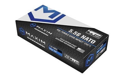 Maxim Defense SBA delivers exceptional performance with a tumble upon impact design. Each box contains 20 rounds of 62 grain 5.56 ammo with solid copper bullets and brass casings. Get your bulk ammo and 556 ammo for sale online from GrabAGun today!