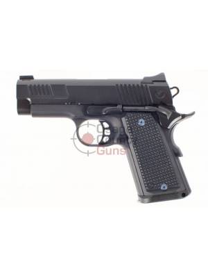 The Counselor is a 9mm, 3.5-inch barrel, 1911 Officer Model, based on a shortened lightweight aluminum frame, complete with an aluminum mainspring housing and grip safety. We’ve added our new bobbed-concealment beavertail and hammer, which are smaller for concealed carry. The gun is in 9mm and features an 8+1 capacity. It also sports a brand-new slide design. Most pistol slides have “negative” serrations. Translation: Material has been machined away from the slide to create slots for your fingers to grip. However, the Counselor has “positive” serrations up front that protrude out from the slide for a unique look and excellent grip for a press-check. Most importantly, the Counselor features our patent-pending Flush-Fit Magwell. We built the Counselor to have the same overall length of an officer frame, but with a magwell included. To accomplish this, we cut an officer frame even shorter, added a channel for its custom-engineered magwell, and the magwell slides in from the front while only adding back the length of the frame it removed. The magwell holds the sear spring in place, a feat that has never been done before. This combination of a small gun with a magwell included is the ultimate solution for concealed carry. Another feature included with this model is an ultra-high, undercut trigger guard, so that most full-size hands can still fit on the grip. Lastly, we have the G10 Scales, which were custom engineered with Railscales for this pistol and “are thinner than the thinnest 1911 grips available on the market.”