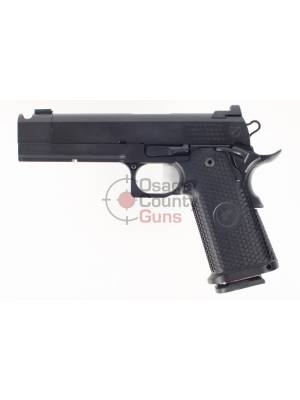 The TRS Comp is Nighthawk Custom’s first model designed around a double stack frame. The Tactical Ready Series was designed to answer the demand for high-capacity pistols. While the TRS Comp meets that demand with 17+1 capacity, it offers much more to the shooter. This model features the same integrated compensator made popular by the Fire Hawk, but on a dedicated double stack frame. A precision designed port in the compensator reduces muzzle flip, allowing the shooter to stay on target for follow up shots. The TRS Comp features a match grade 5” barrel on a government sized frame with a monolithic slide. A full-length dust cover gives the pistol added weight up front, aiding in reducing muzzle flip. The entire pistol has been finished in black nitride for a sleek, durable look. The solid stainless trigger possesses a serrated flat face, providing a non-slip surface when pulling the trigger. An 18K gold bead front sight does an excellent job catching light, providing quick target acquisition for the shooter, with a Heinie Ledge Black rear sight. The TRS Comp utilizes unique dimples at the rear of the slide, matching the pattern of the grip. These dimples provide a non-abrasive surface that won’t snag clothing when holstering. The Tactical Ready Series breaks new ground for Nighthawk Custom. Combining high-capacity and innovation, the TRS Comp was designed to be unrivaled at the range.