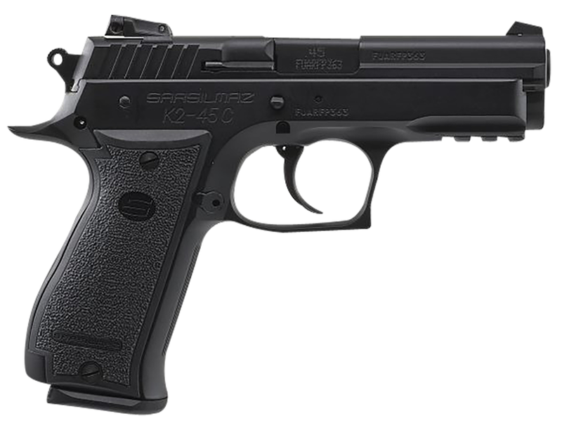 SAR USA K2 Compact Pistol Features The K2C 45C is a precision machined example of the quality of the SAR USA lineup. The aluminum frame is precision CNC machined to exacting specifications. The pistol is loaded with features including a beavertail frame to allow the shooter’s hand to feel as one with the pistol, 3 dot adjustable sights that are ideal for target shooting, a loaded round notch in the barrel to show if there is a round in the chamber, and a picatinny frame rail for your favorite accessories. The double / single action trigger is smooth and crisp. The frame safety allows the shooter to carry the pistol cocked and locked or just safe if the hammer is down. A true work of art and a must for any gun enthusiast. SAR USA K2 Compact Pistol Specifications Brand: SAR USA Model:Â K2Â Compact Caliber: 45 ACP Frame Finish: Black Action: Single Action / Double Action Slide Description: Black Steel Capacity: 13 + 1 Frame Material: Aluminum Grips: Black Polymer Hand: Right Safety: Manual Sight Configuration: 3 Dot Sight Style: Adjustable Weight: 38 Oz Barrel Length: 4.2″