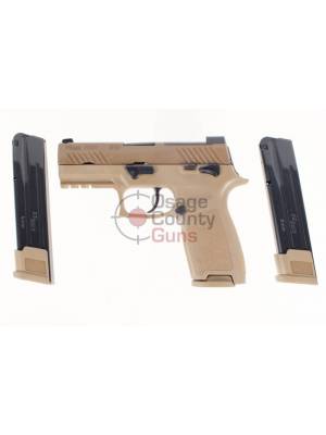 This is the new Sig Sauer M18. It is similar to the M17, but in a P320 Carry format with the 3.9″ barrel vs. the 4.7″ barrel on the M17. It includes the Coyote colored grip module, (1) 17rd Magazine, and (2) 21rd Magazines.