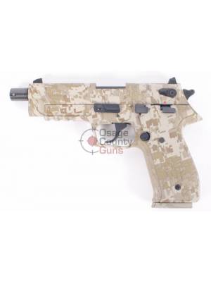 Only 90% the size of a P226®, it’s the ideal choice for hours of shooting fun. It’s Desert Digital Camo coated polymer frame and integral accessory rail is ergonomically designed to enhance accuracy and provide a better all-around shooting experience. Additional features include a rugged blowback system, fixed barrel and adjustable sights. It’s also loaded with safety features that include a decocking lever and the automatic drop safety you’d expect in a SIG SAUER pistol. It’s further enhanced with an ambidextrous manual slide mounted safety, magazine safety and internal locking device. An optional Threaded Barrel Adapter facilitates the mounting of accessories requiring a ½ x 28 thread pattern, including many popular sound suppression devices