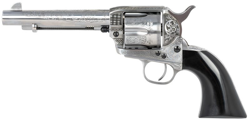 Taylors and Co 1873 Cattleman Features This special finished Taylors & Co 1873 Cattleman is floral photo engraved and then hand-chased for extra depth at the factory. The 1873 Cattleman also features a coin finish forged steel frame, blued steel parts, and a walnut Navy size grip. Requires an FFL dealer to ship. The Taylors & Co Tuned Cattleman Photo Engraved Coin Finish comes ready to shoot out of the box featuring a hand polished action and our custom springs. Taylors and Co 1873 Cattleman Specifications Action: SA Caliber: .357 Mag Capacity: 6 Grip: Walnut Finish: Coin (Photo Engraved) Sights: Blade Barrel Length: 5.5” Overall Length: 11” Weight: 2.3 lb